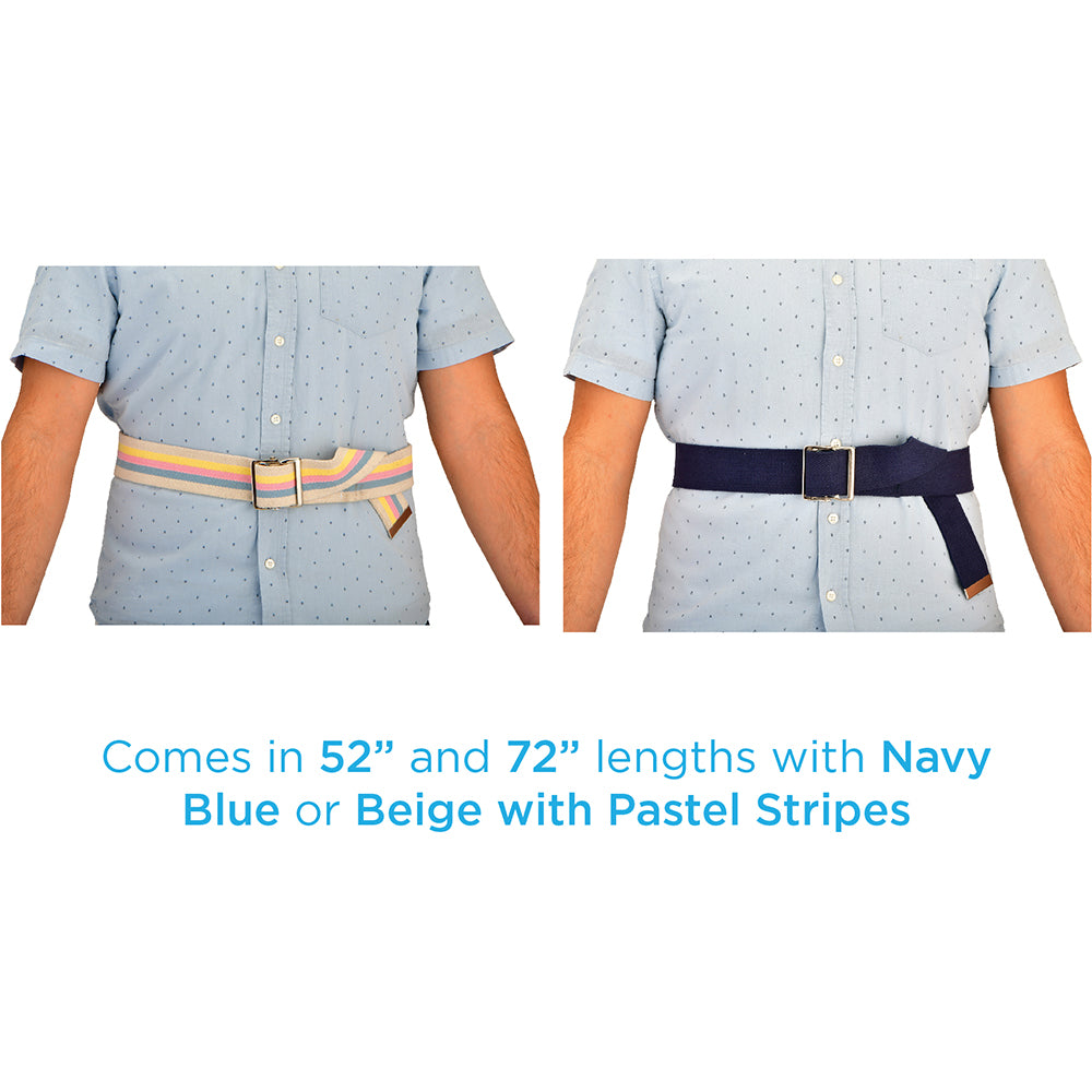 - CHOOSE YOUR SIZE AND STYLE. The gait belt is 2” wide and comes in 52” and 72” lengths. Style options are Navy Blue and Light Beige with Pastel Stripes.