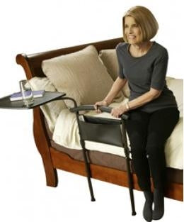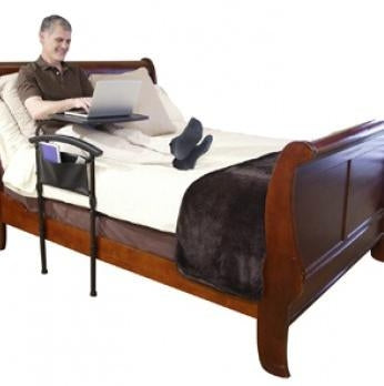 The Independence Bed Table is the only bed rail on the market that combines the safety of a bed rail with the luxury of a bedside tray. The handle offers assistance while standing, prevents nighttime falls, and comes with a luxury tray that swivels out of the way when not in use. The legs extend to the ground for extra stability, and the leather organizer can keep books, medications, or glasses close by. And like all of our products, it looks like a piece of furniture to maintain the comforting feeling of your home.